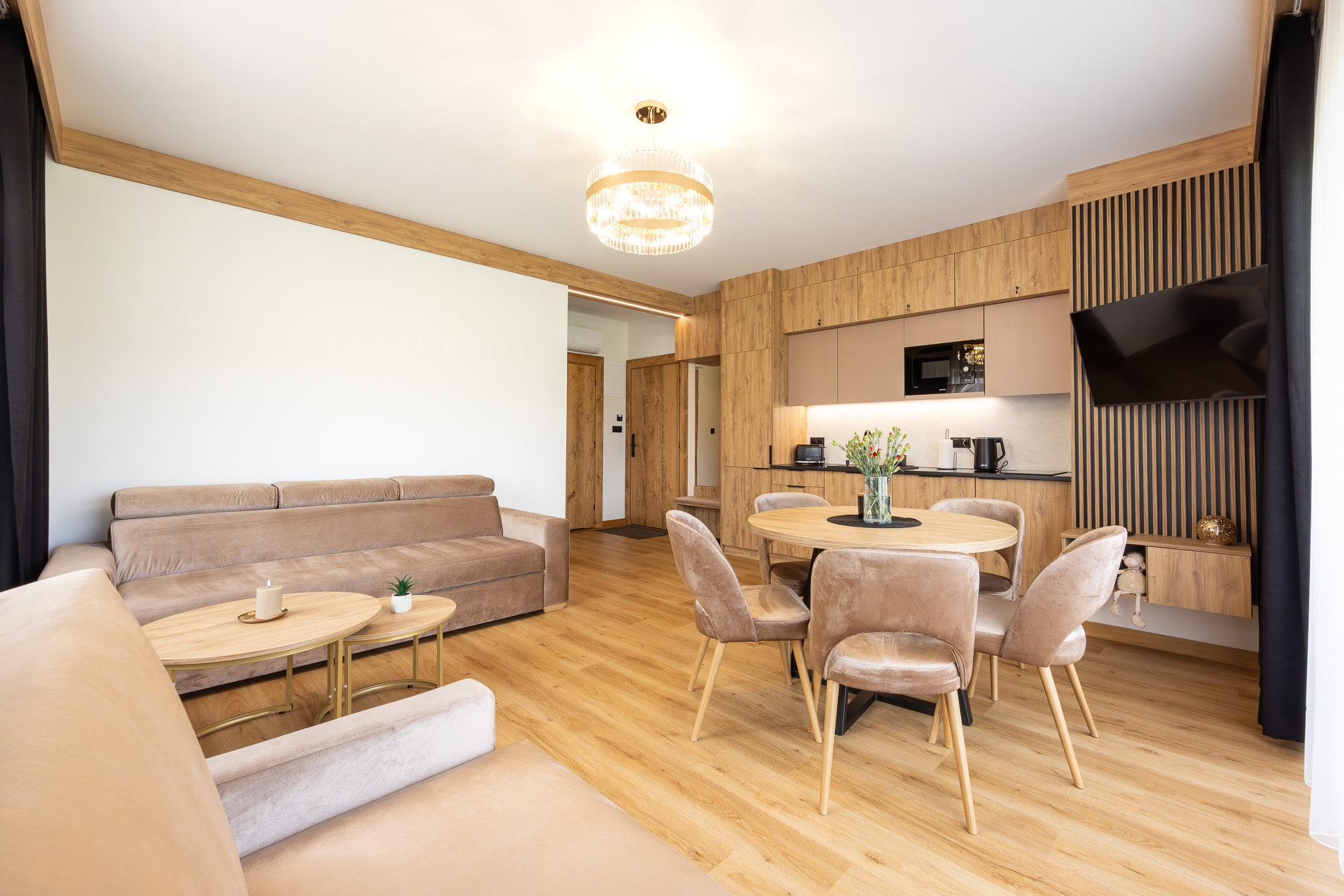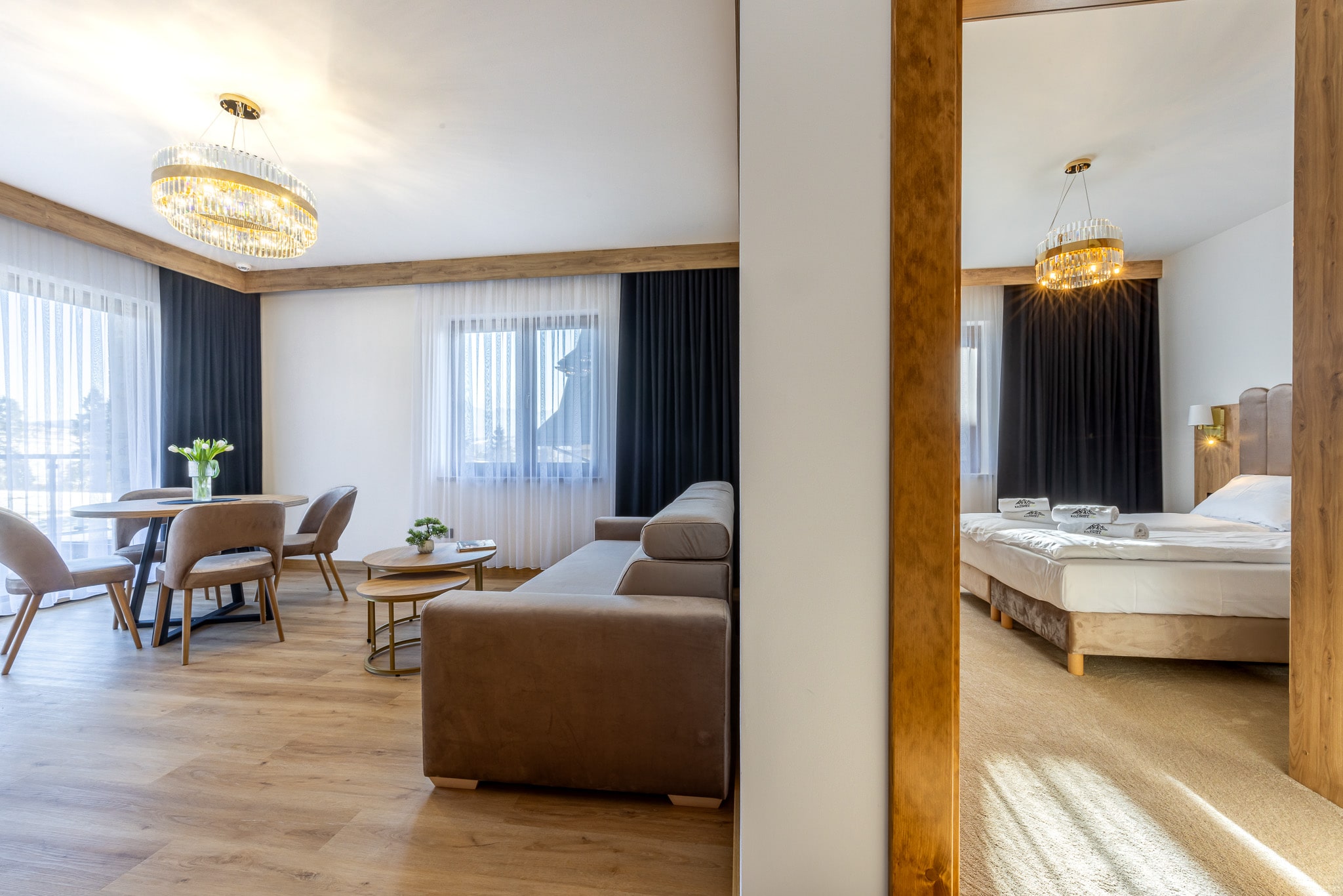 Sypialnia małżeńska z łóżkiem podwójnym oraz rozkładana sofa w salonie