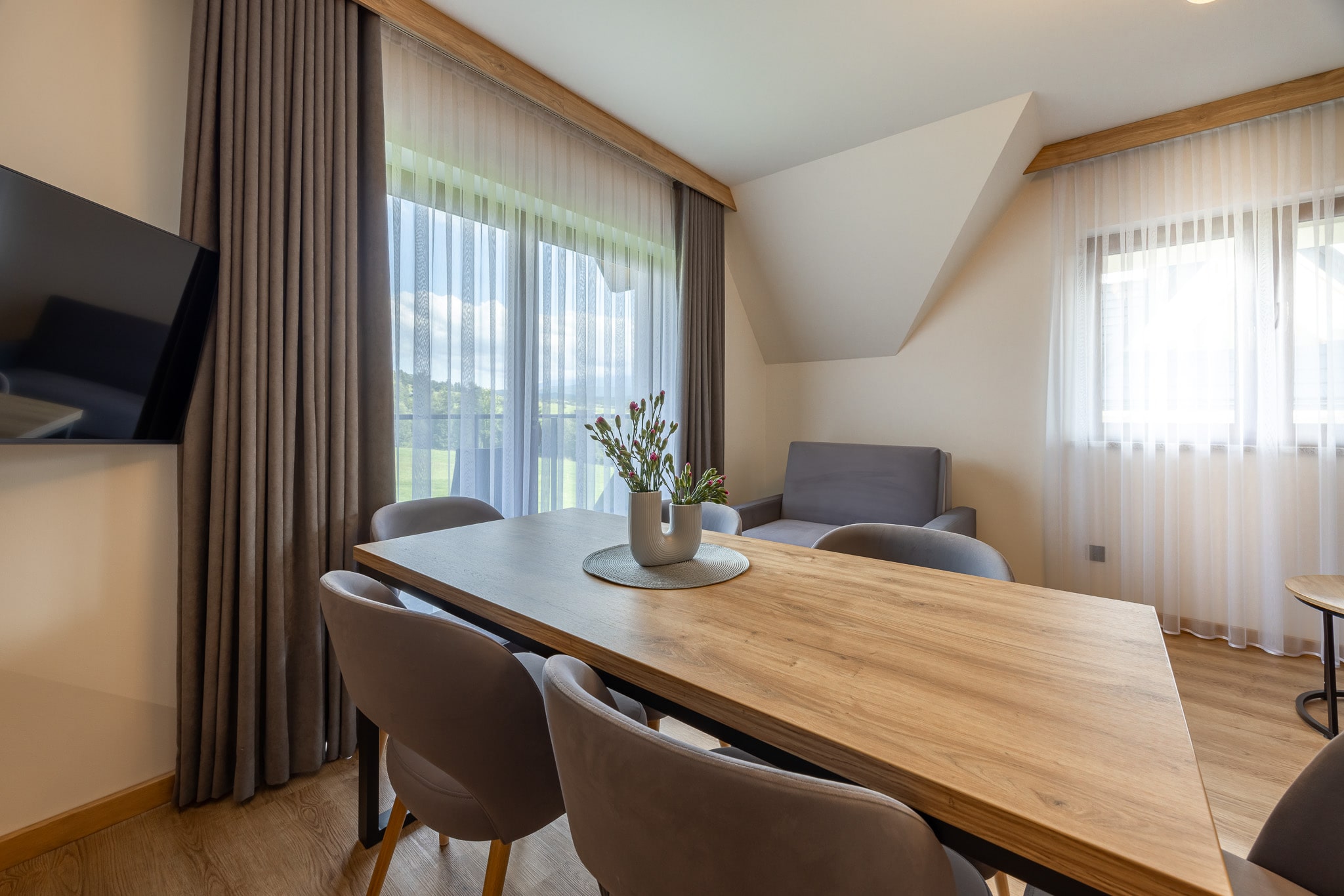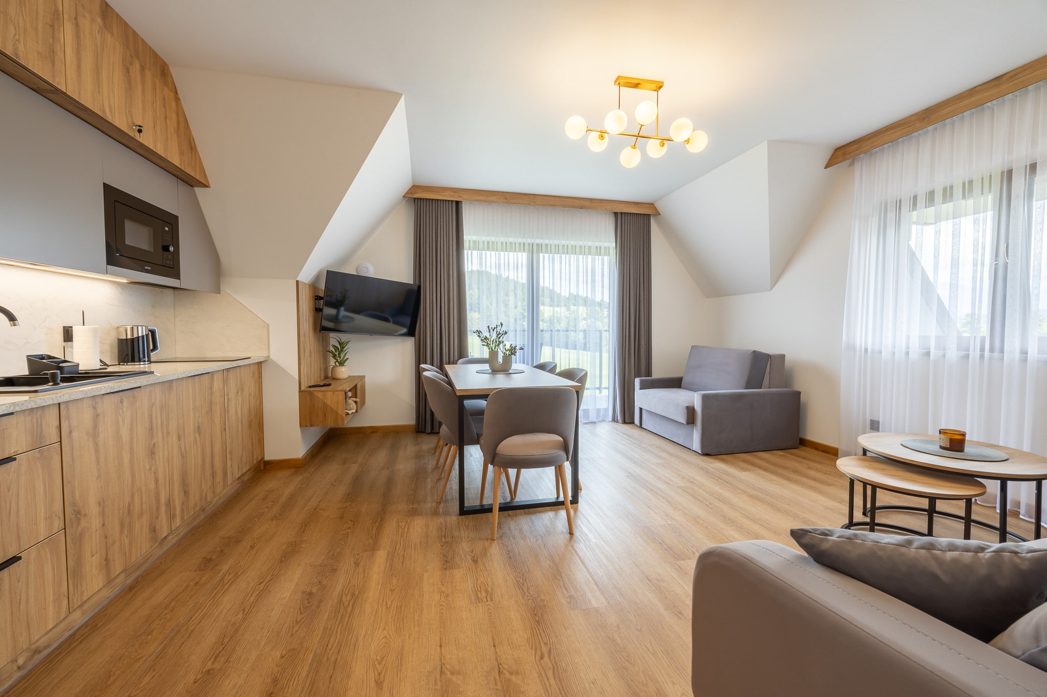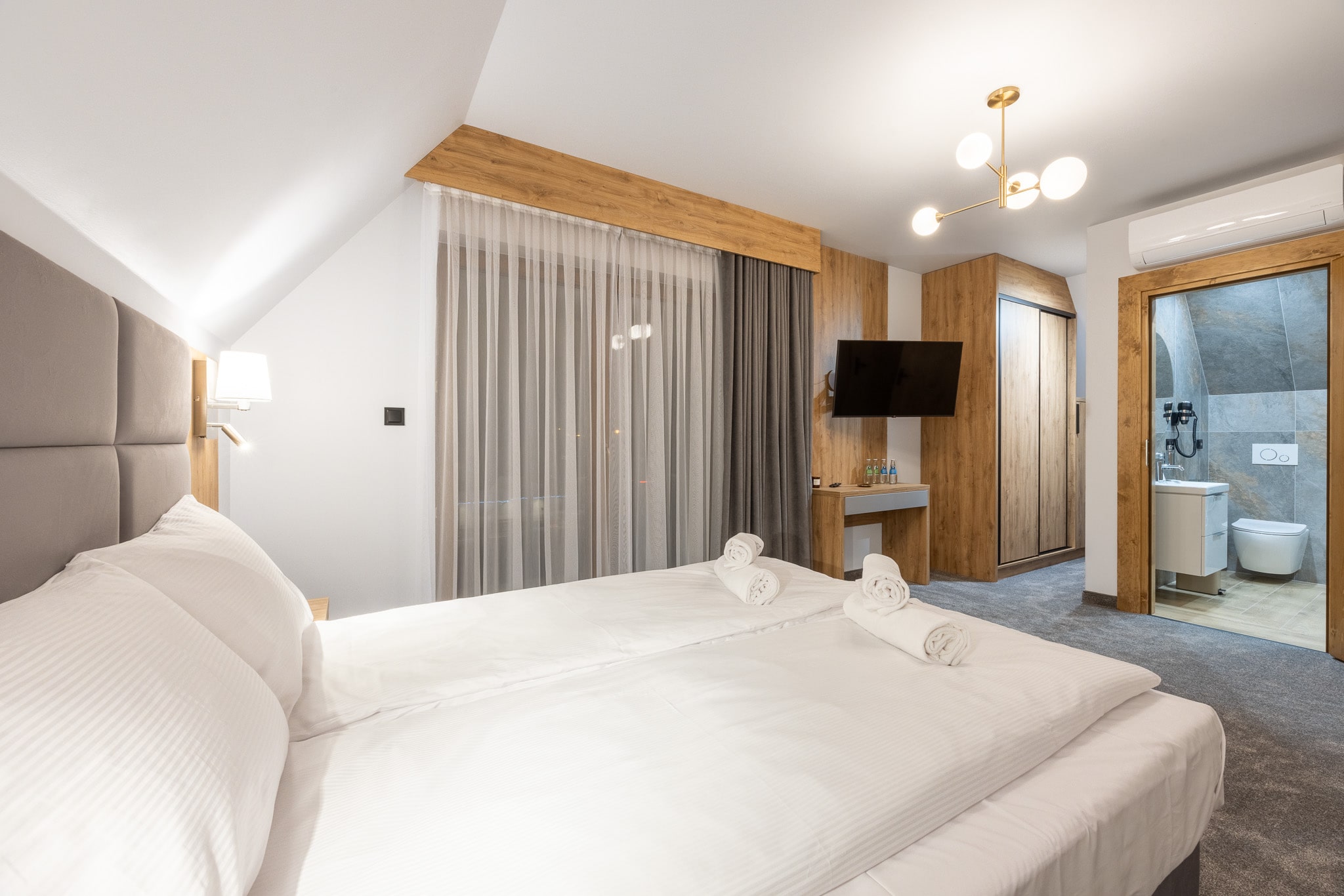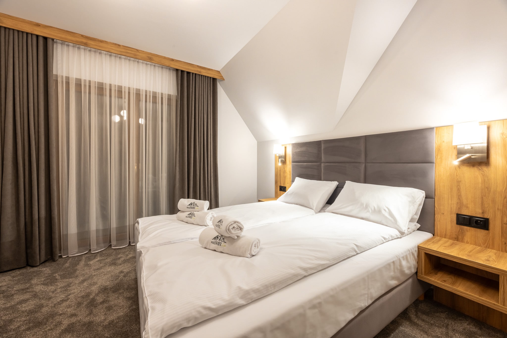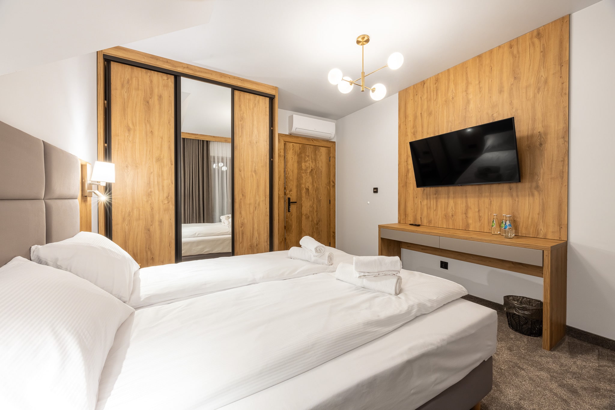 Dwie sypialnie małżeńskie z łóżkiem podwójnym oraz rozkładana sofa w salonie